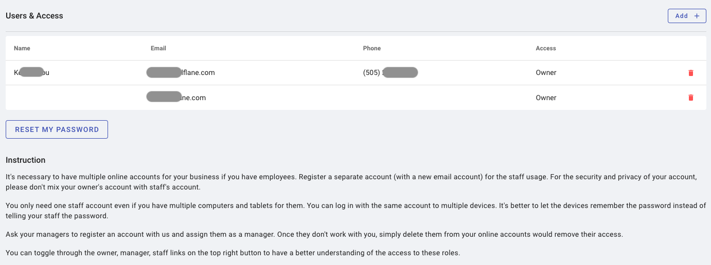 Owner: has access to everything and the included businesses. Manager: has access to non-admin functions and the included businesses’ same level of access.