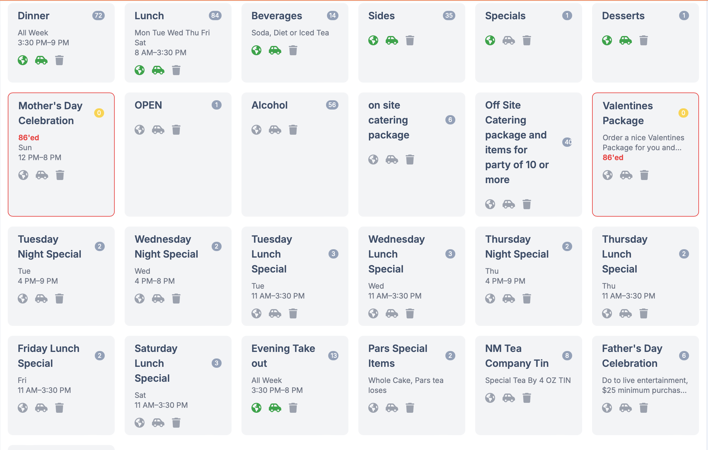 - A car (If Integrated with Chowly.) – Will make the menu available on third-party platforms when highlighted green.