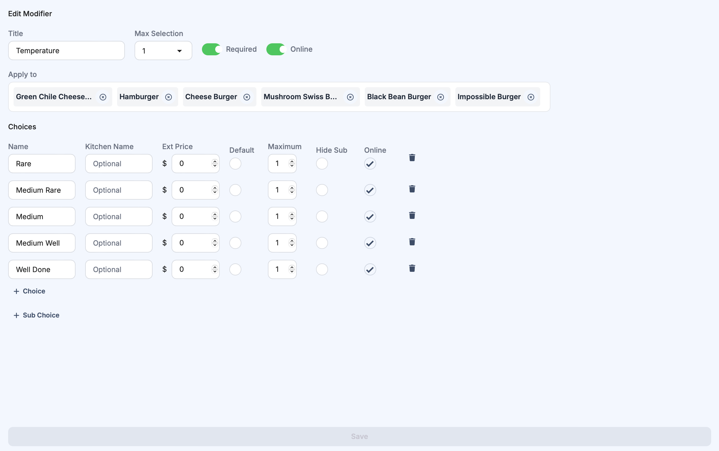 - To allow multiple selections of the same modifier choice define the max number of choices using the drop-down menu under “Maximum”.