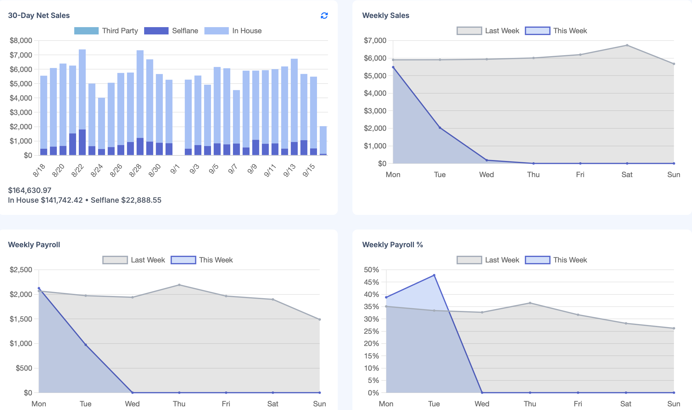 Back OfficePerformanceDashboardCopy pageDashboard This is a 30-day rolling view only report of your business. 30-Day Net Sales Weekly Net Sales Weekly Payroll $ Weekly Payroll % Last updated on September 2, 2025IntroductionSales