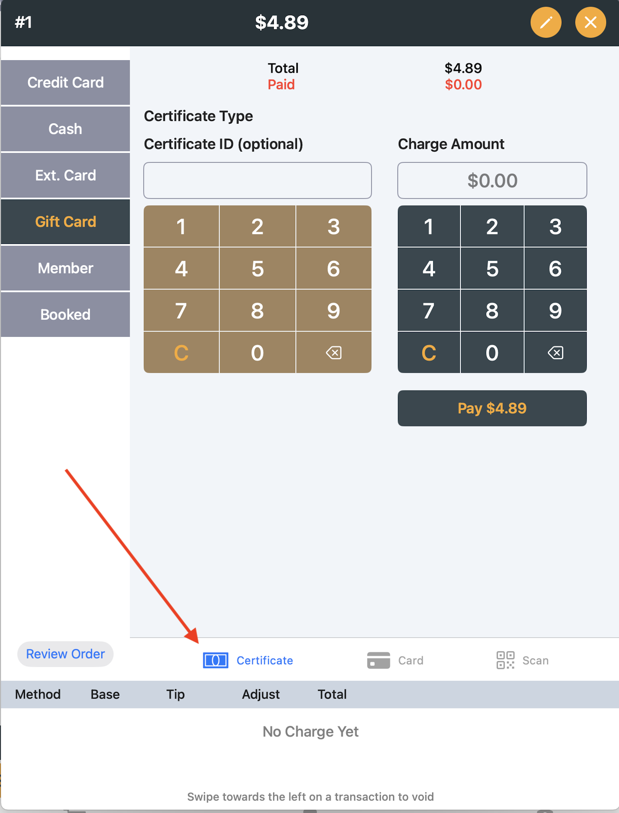 Simply navigate to the Pay screen, click on Gift Card, and choose Certificate, as demonstrated in the screenshots below.