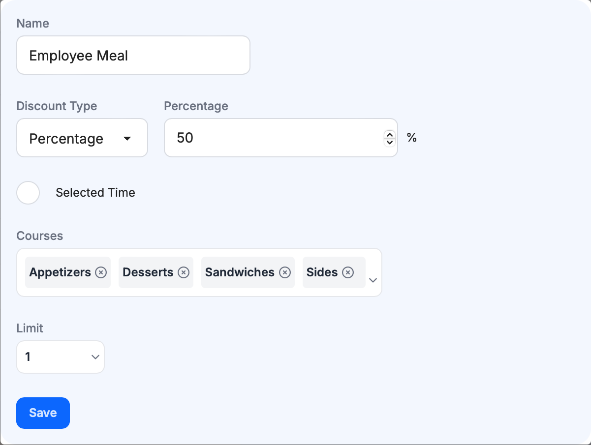 - Set selected items with a percentage discount. e.g., 10% off when made in meal.
