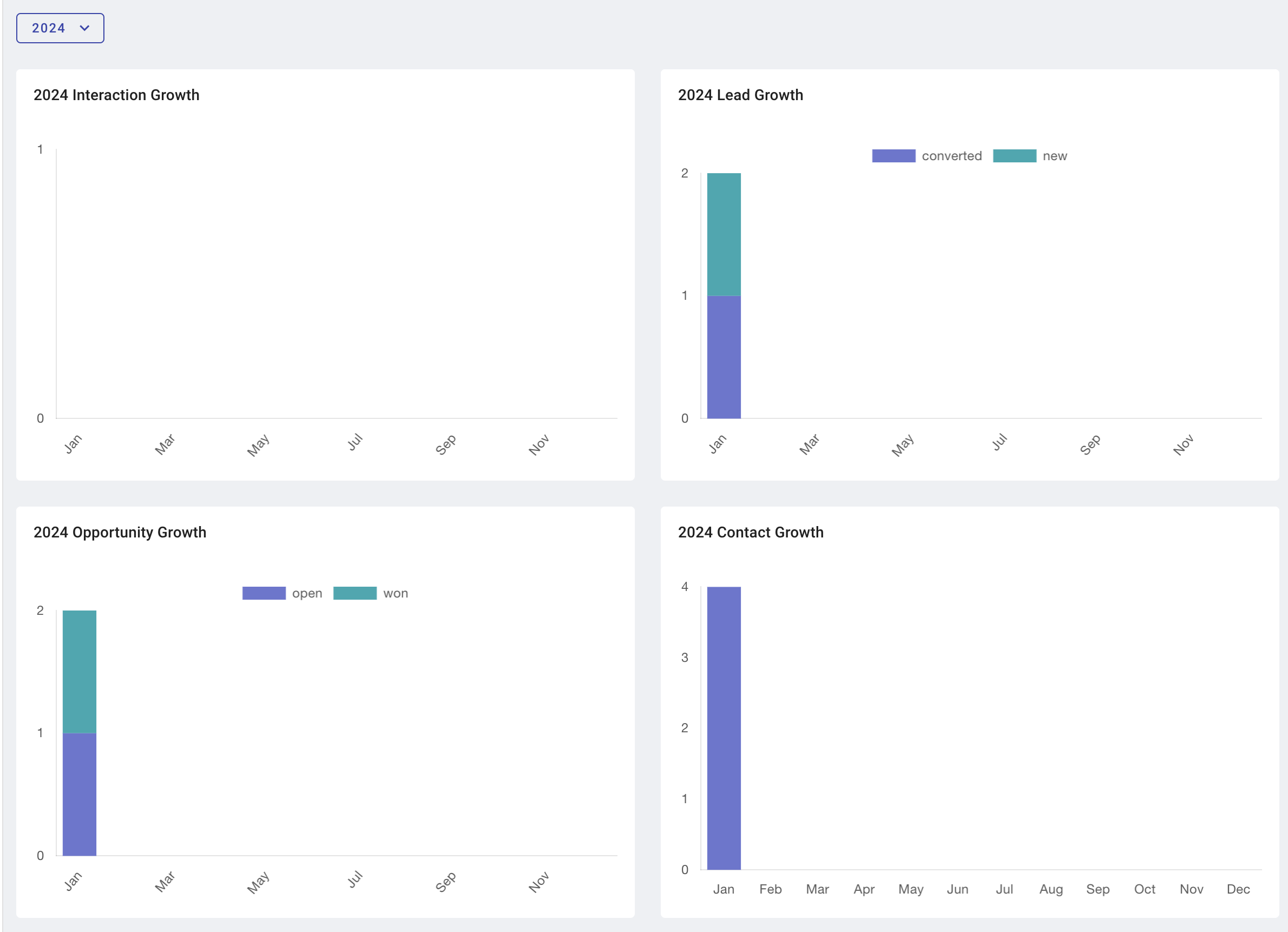 The Dashboard provides a swift overview of activities across key categories, encompassing lead and opportunity growth, interactions, and contact expansion.