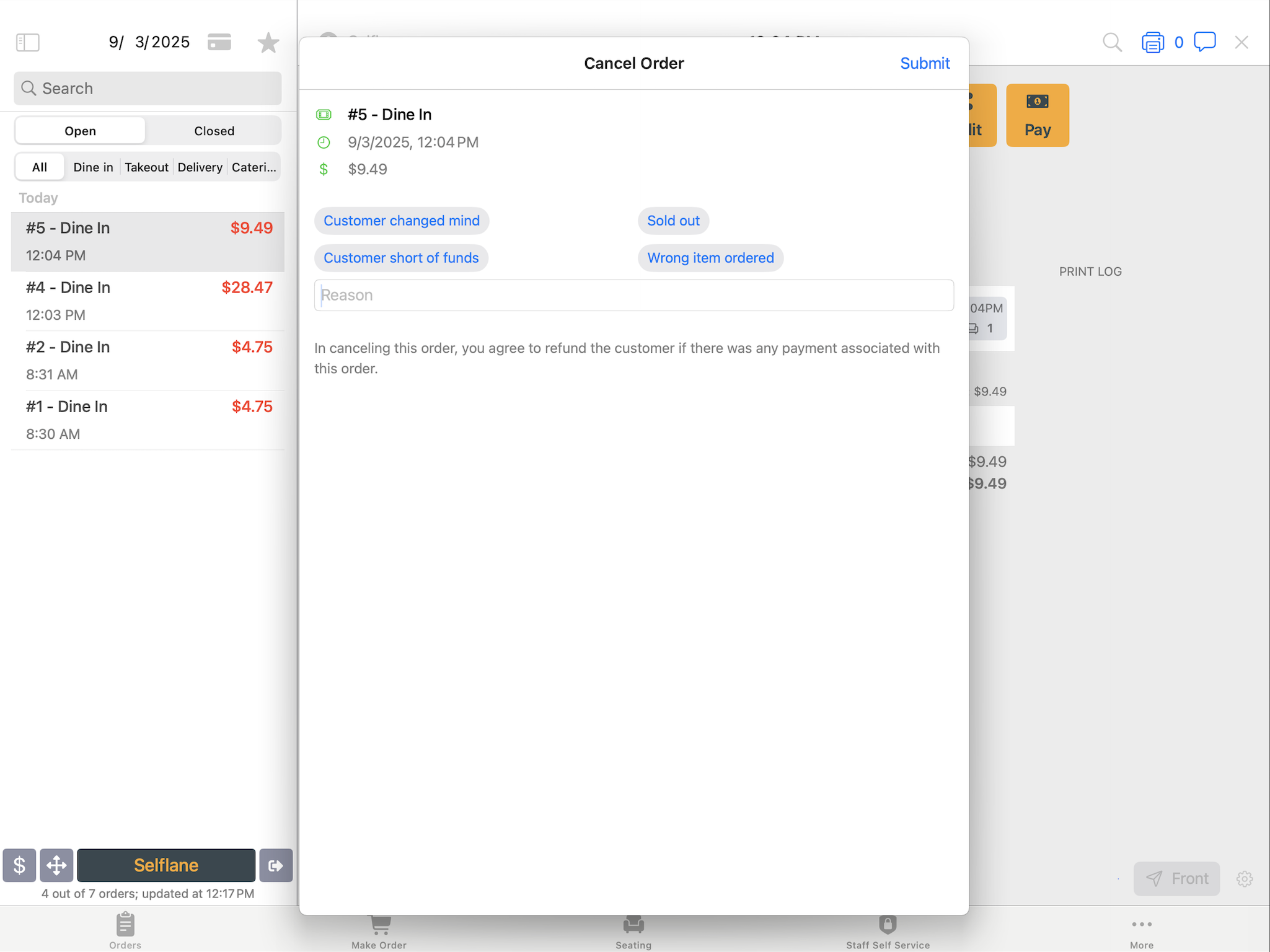 A reason is required before canceling an order. The canceled order would be reported on daily report.