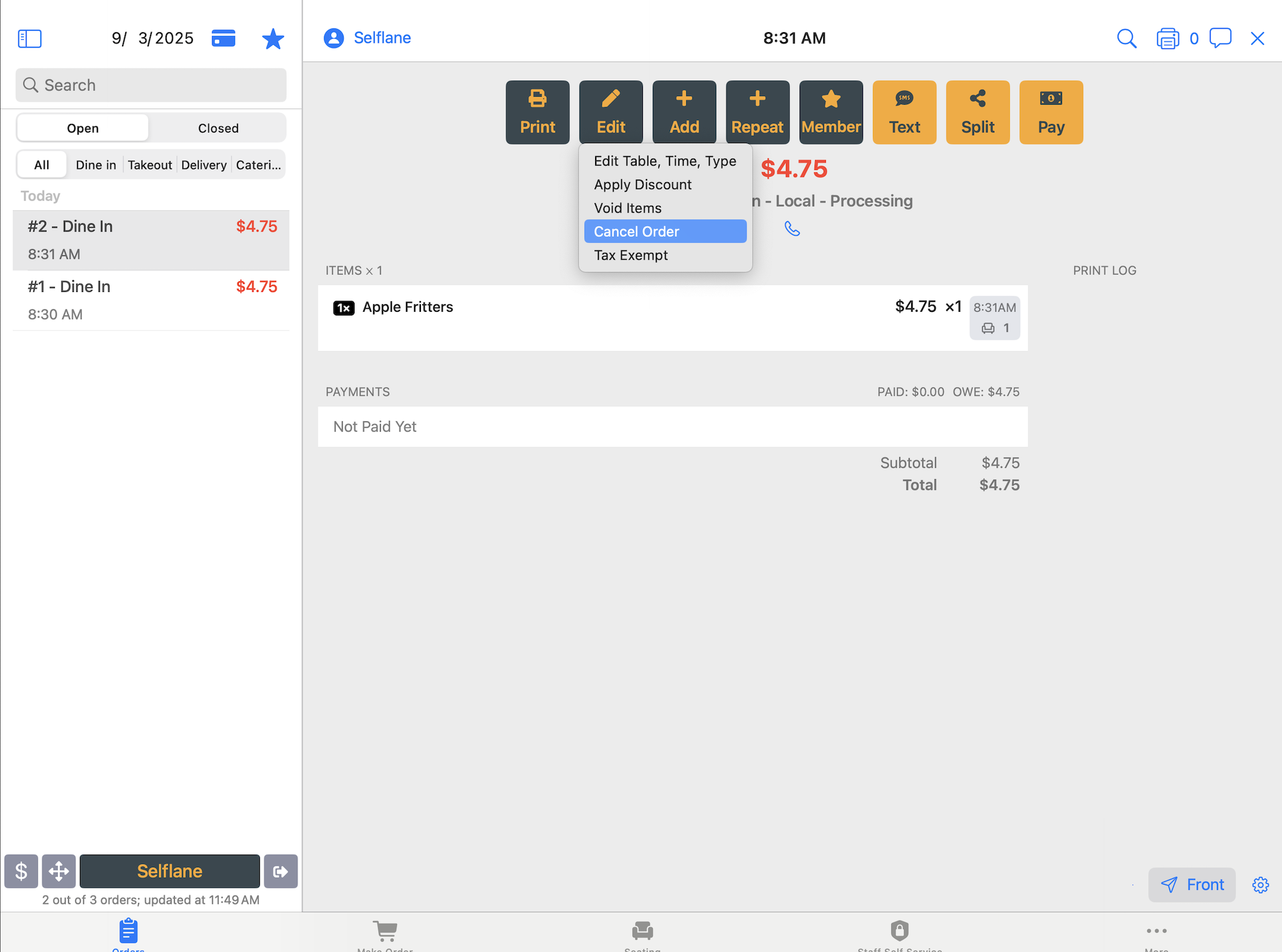 Only orders with no payments or split check can be canceled. Need to cancel an order with payment? Please void the payment first.