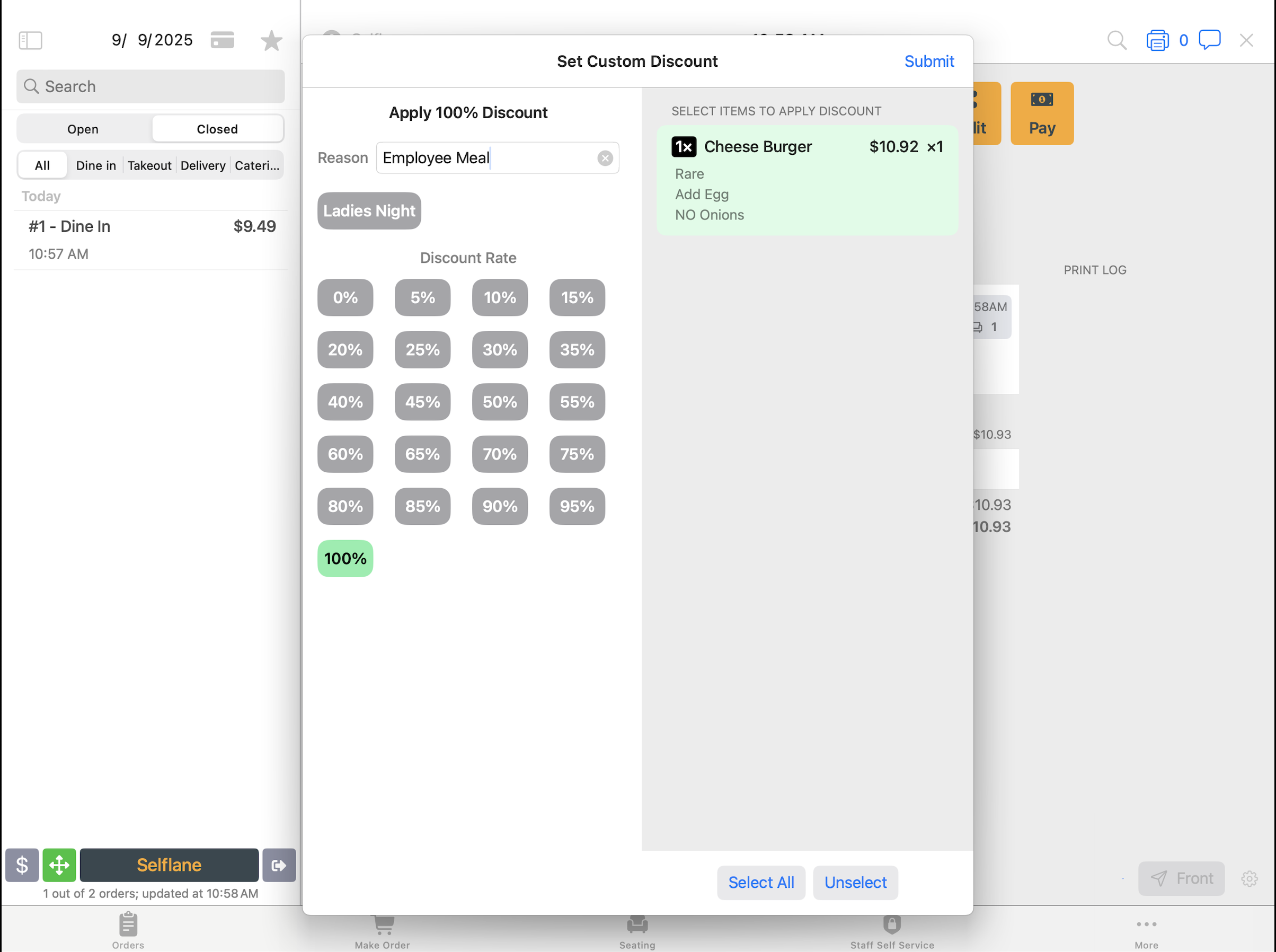 You can discount on selected dishes or all dishes. Choose 0 discount rate to un-discount selected dish.