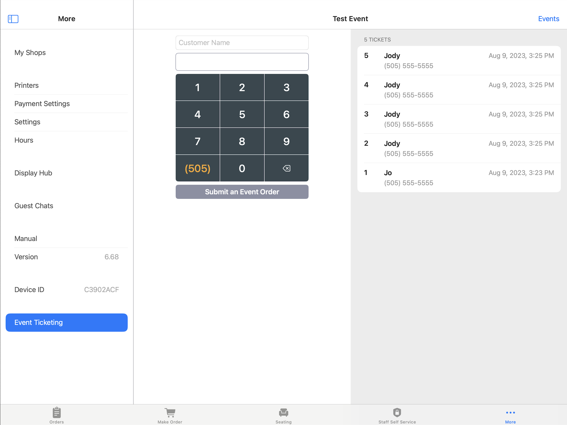 More/Event Ticketing - To sell and enter the person in the fundraiser, enter their name and phone number by tapping the respective entry box. When completed tap