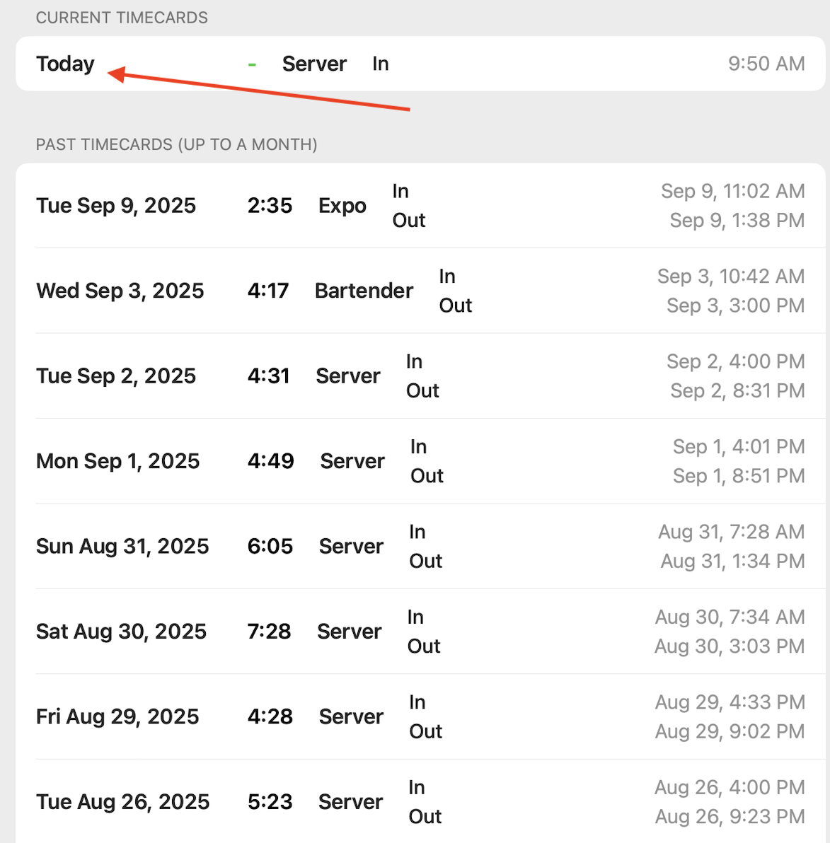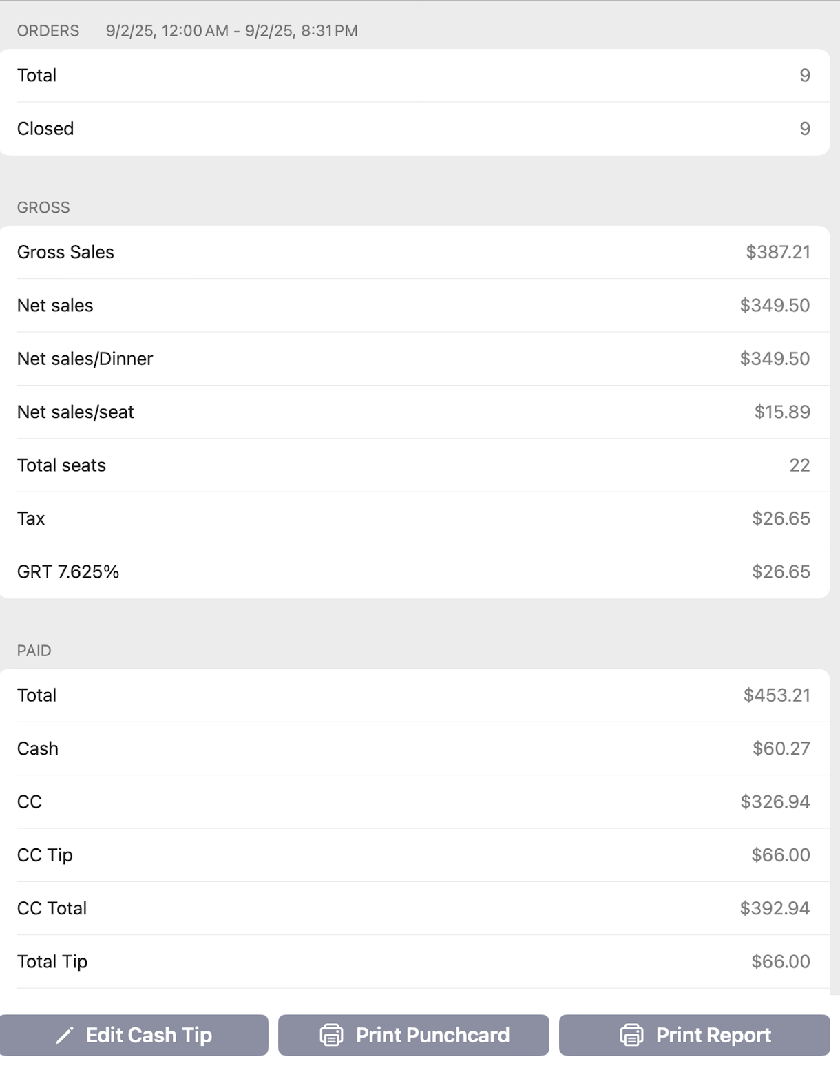 Point of SalesManualServer ReportCopy pageServer Reports Tap Staff Self Service. Select the server and enter their passcode. Tap Today under Current Timecards to access the report. Tap Print. Last updated on September 2, 2025Print ReportSeating